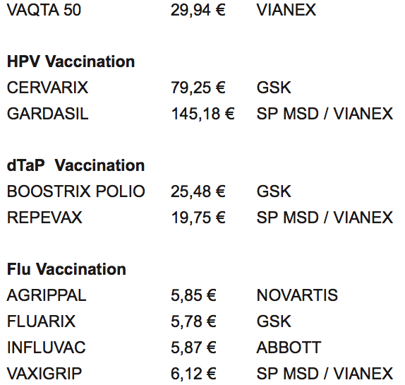 Παρακάτω αναφέρουμε τις τιμές των εμβολίων που κυκλοφορούν στη χώρα μας (τιμές Αυγούστου 2013).